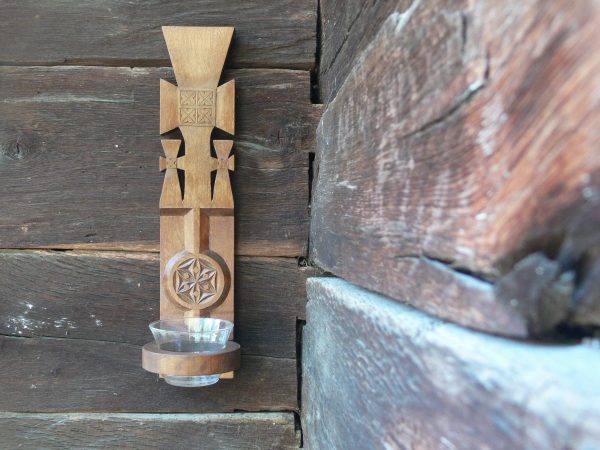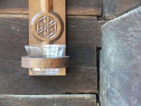 Pe partea din spate are fixata o agățătoare metalică amplasată sub nivelul lemnului, asigurând o așezare sigură și completă a candelei pe perete.