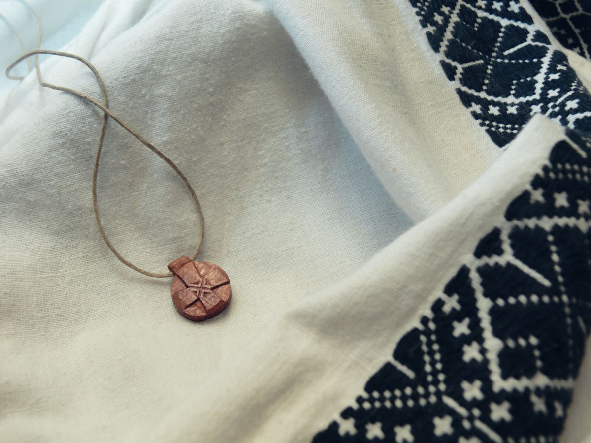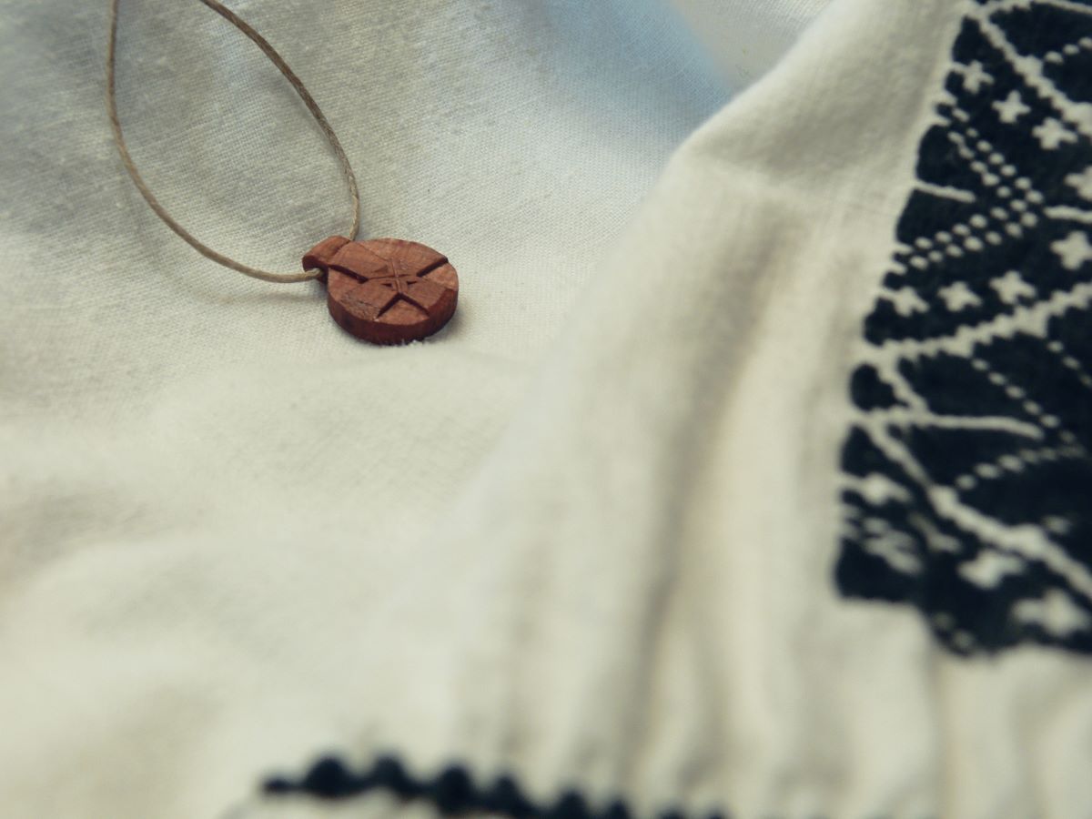 Cruce lucrată manual din lemn de prun finisaj shellac, șnur bumbac cerat